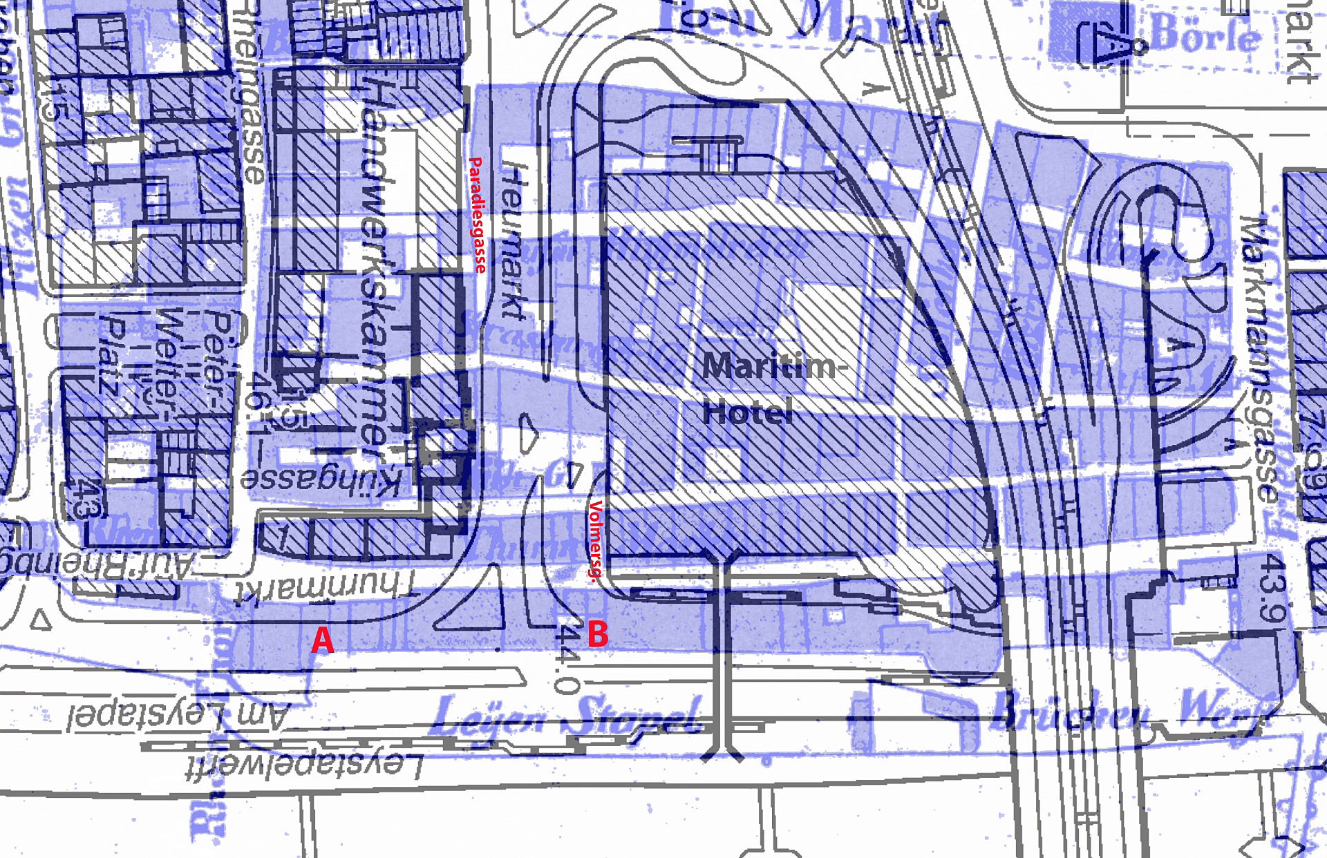 Das heutige Kölner Stadtkataster unterlegt mit dem Katasterplan 1836 (Waschpforte = A; Zollpforte = B). Bearbeitung Hess/Kremer
