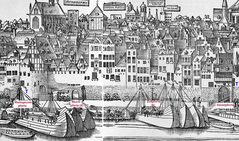 Das Kölner Rheinufer mit Wasch- und Zollpforte auf der Ansicht von Anton Woensam, 1531. Bearbeitung Hess/Kremer